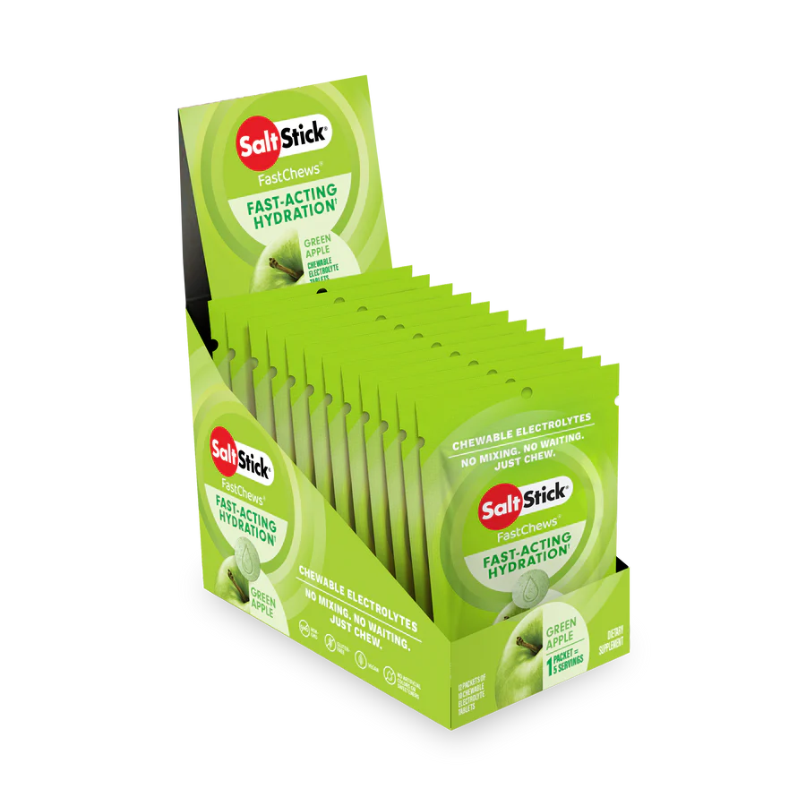 SaltStick Fast Chews Green Apple are a crisp, refreshing, and convenient way to replace electrolytes and stay hydrated during exercise, competition, or daily activity. With a tangy green apple flavour, SaltStick Fast Chews Green Apple deliver rapid electrolyte absorption in as little as 45 seconds – no mixing, no waiting, just chew and go.